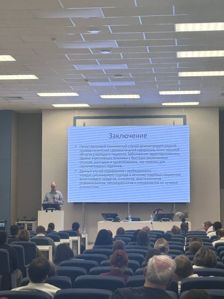 Кроме того, участники заседания узнали о крайне редком клиническом случае осложненной гигантской саркоматоидной карциномы кожи заушной области, представленном врачом-онкологом отделения противоопухолевой лекарственной терапии Городского онкодиспансера Иваном Александровичем Герком.