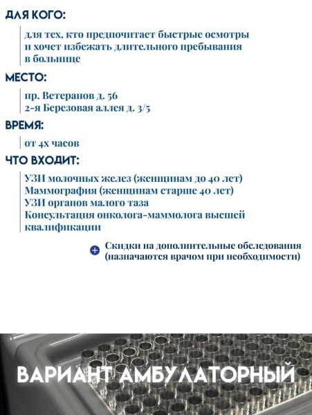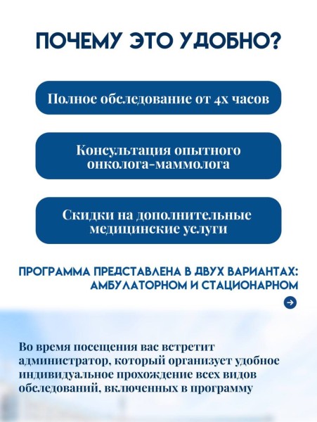 Рассказываем в карточках о комплексной маммологической программе, которую можно пройти в Городском онкодиспансере в формате быстрого и удобного обследования в одном месте за один день!